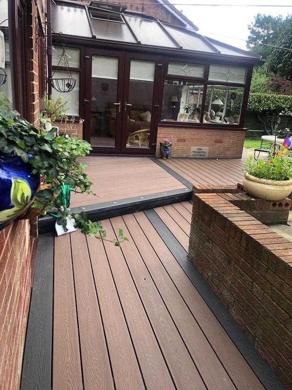 "DSK Plastics and Building Supplies Ltd was recommended to me by a friend who had recently used their products for a home decking installation project. The composite decking supplied by DSK is a high quality, ‘full colour’, 5m long product. The 5m lengths although more expensive than the commonly used 3.2m boards actually save you money as you are not cutting full boards to make up your run and then disposing of expensive ‘off-cuts’. As you can see from my photo’s I don’t have any joints in the decking runs thanks to the length of the 5m boards from DSK. Also, the ‘full colour’ board is a ‘must’ for the ‘longevity’ of your project. Some of the inferior products from competitors are basically a 3.2m neutral colour composite board with a ‘vinyl wrap’. The vinyl wrap, if ‘chipped’ by a metal garden chair or other decking furniture, will become unsightly and ‘spoil’ the look of your decking as you will see the colour of the ‘underboard’. The DSK products have the ‘full-colour’ of the composite board all the way through so any slight chip or dent, will not result in ‘another’ colour showing through.